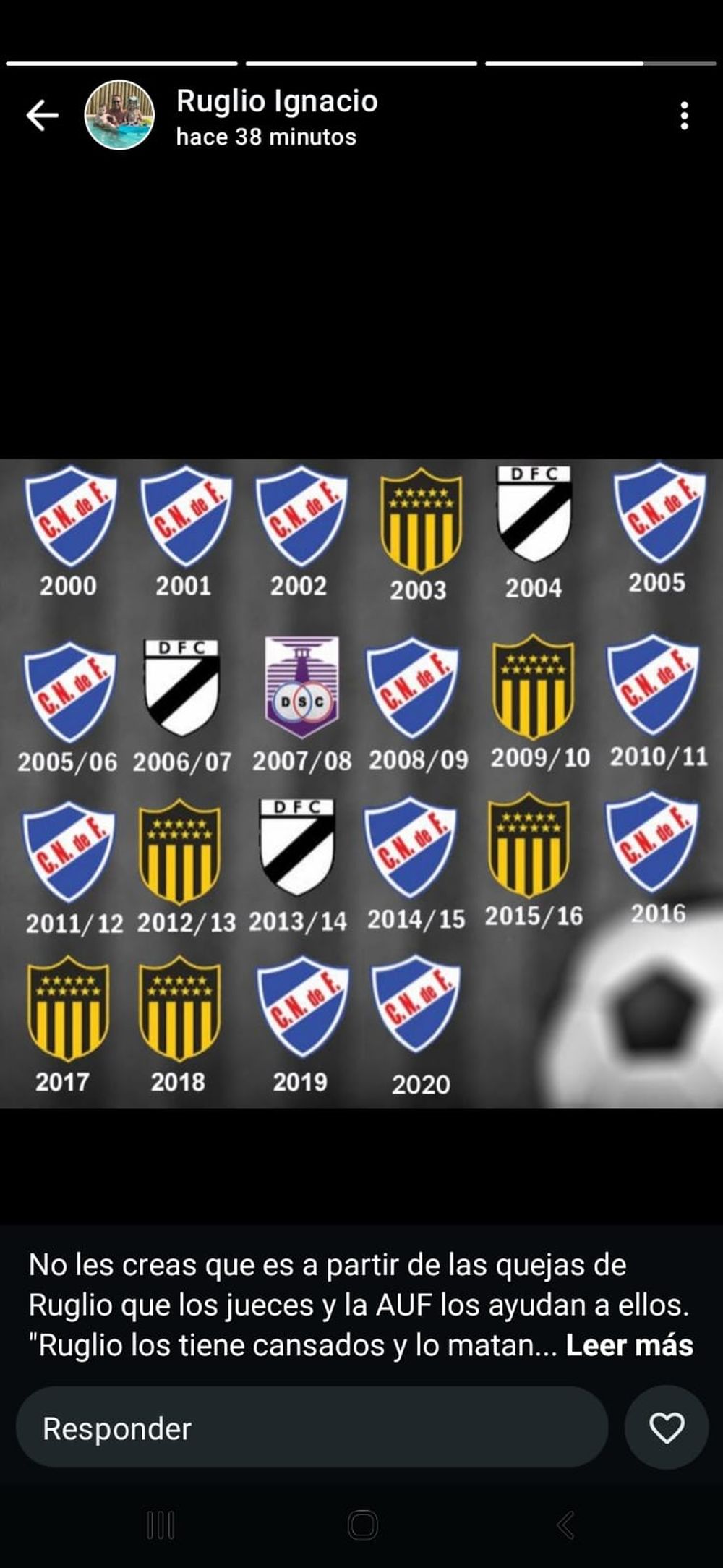 "No les creas que es a partir de las quejas de Ruglio que los jueces y la AUF los ayudan a ellos. 'Ruglio los tiene cansados y lo matan a Peñarol'. Estudien lo que fue este siglo y van a ver que tienen tomados a los árbitros desde el inicio del siglo y empujan siempre al mismo equipo deliberadamente año a año incluso en cosas groseras como las de ayer porque saben que en vez de recibir castigo en sus tareas, reciben premios de competencias internacionales. Ni Ruglio ni sus quejas estuvieron del 2000 al 2020. Hasta que esto no caiga los van a empujar durante todo el año y en cada partido que necesiten, incluso si tienen que ganar sí o sí una final como los ayudaron ayer", escribió.