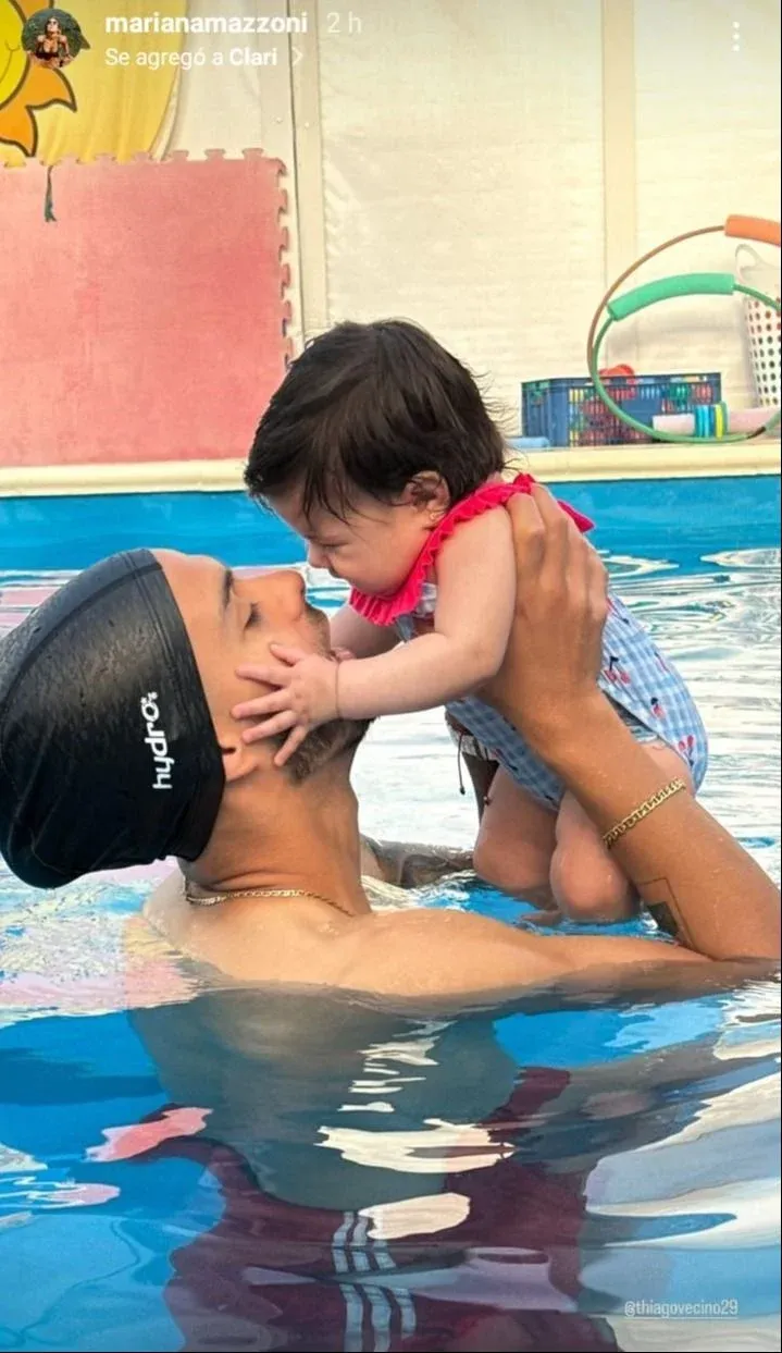 Antes del crucial partido, el atacante disfrutó del agua junto a su bebita Clari.