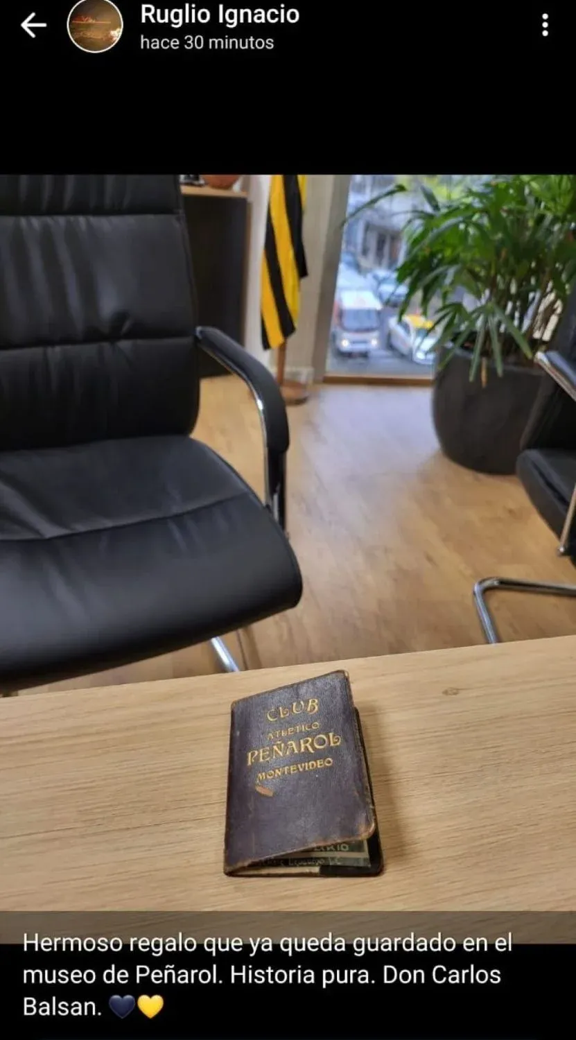 "Hermoso regalo que queda guardado en el Museo de Peñarol. Historia pura. Don Carlos Balsán", escribió Ruglio este lunes en su estado de Whatsapp.