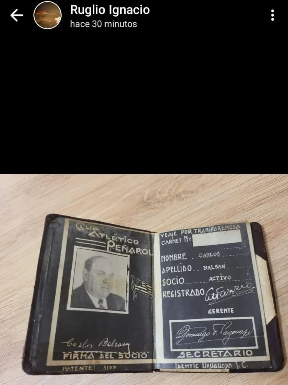 El carné de socio de Carlos Balsán, dirigente histórico de Peñarol, que le regalaron al presidente Ignacio Ruglio