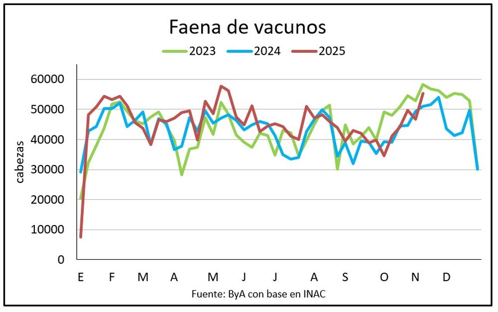 La faena de la semana pasada fue de 55.267 vacunos, la tercera más alta del año con una fuerte participación del corral.