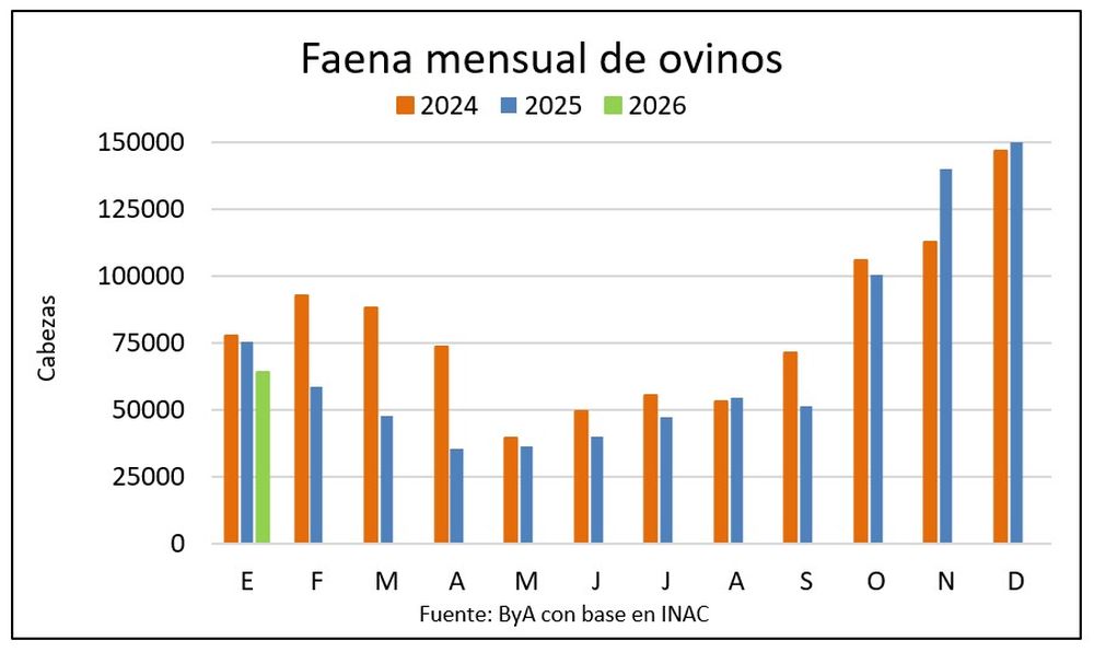 En enero fueron faenados 63.813 lanares, con una caída interanual de 22%, unos 15 mil animales menos que en el mismo mes de 2025.
