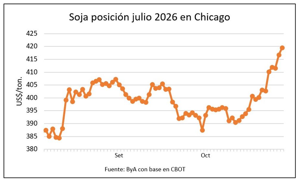 El balance final es un mercado tonificado: la soja cerró octubre con una suba semanal de 5% y de 8,3% en el mes a US$ 419, el valor más alto de la serie para la posición julio 2026, referencia de la próxima cosecha en Uruguay y en el caso de la soja disponible de la actual cosecha en Estados Unidos a US$ 404 por tonelada, el valor más alto desde setiembre 2024.