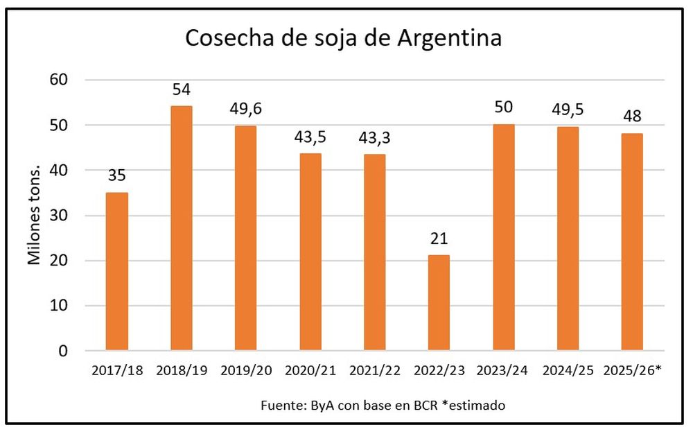 En Argentina las principales Bolsas agrícolas estimaron esta semana una cosecha de entre 48 y 48,5 millones de toneladas de soja, por debajo de los 49,5 millones de toneladas de la zafra pasada.