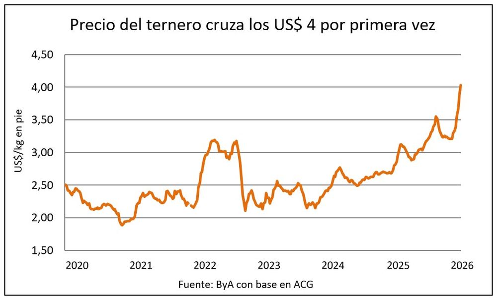 El ternero cruzó por primera vez los US$ 4 de promedio en la grilla de ACG de esta semana, ganando 15 centavos frente a la semana anterior.