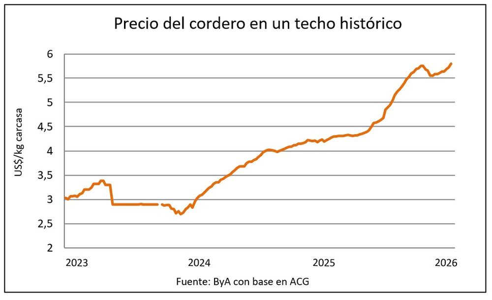 En este escenario los valores de la hacienda ovina se mantienen en referencias récord y con subas semanales por encima de US$ 5,80 para el cordero y US$ 4,80 las ovejas.