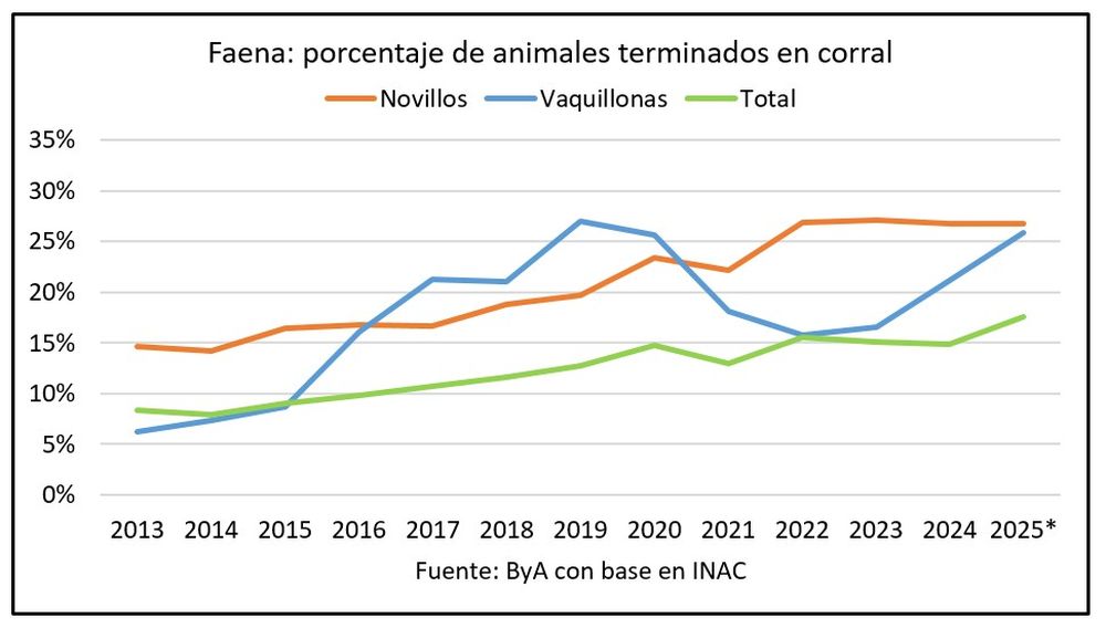 El 27% de todos los novillos faenados en 2025 procede de corral, manteniendo una proporción que ha sido estable en los últimos cuatro años. En el caso de las vaquillonas la proporción viene subiendo hace tres años y saltó de 21% en 2024, a 26% del total de vaquillonas faenadas este año.