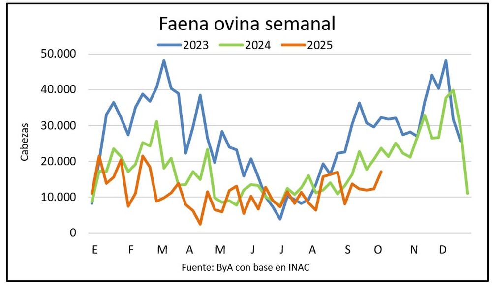 La faena de ovinos fue la más alta desde febrero con 17.093 animales en la semana del 5 al 11 de octubre, y el 96% de la actividad concentrada en tres plantas: San Jacinto, Las Piedras y Oferan.
