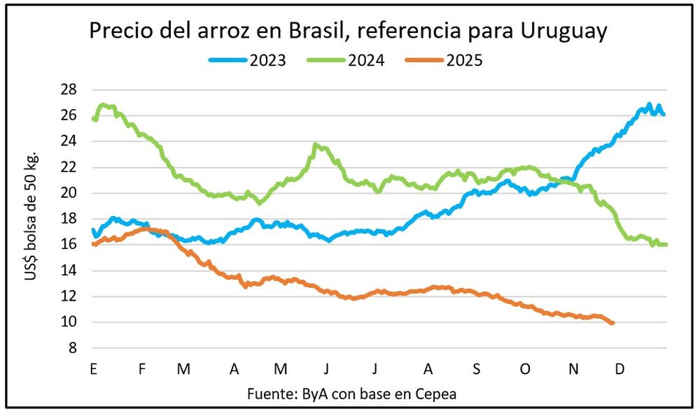 El precio del arroz en Brasil no encuentra piso y en tres de las últimas cinco jornadas perforó la línea de los US$ 10 por bolsa -con cierto efecto cambiario por la suba del dólar-, y tuvo una caída de 5,4% en el último mes.