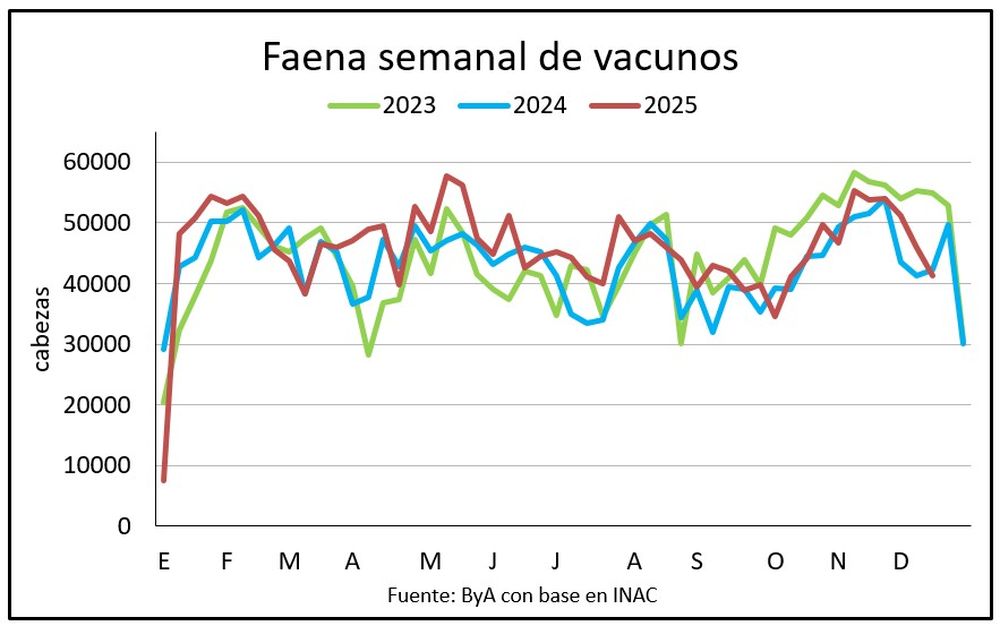 El último dato de faena fue el más bajo de las últimas nueve semanas con 41.295 vacunos, 10% menos que la semana anterior.