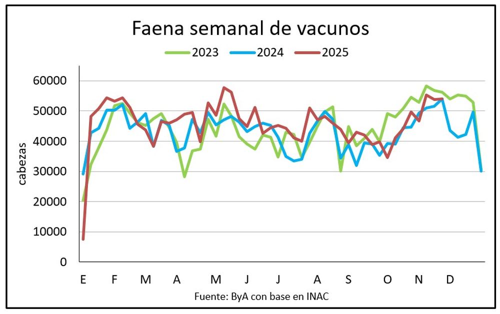La faena se mantuvo similar a la semana anterior, con 53.903 vacunos.