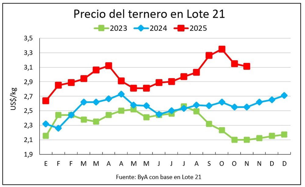 En carne bovina fue de US$ 5.116 por tonelada, un 14% por encima de los US$ 4.492 promedio de octubre de 2024.