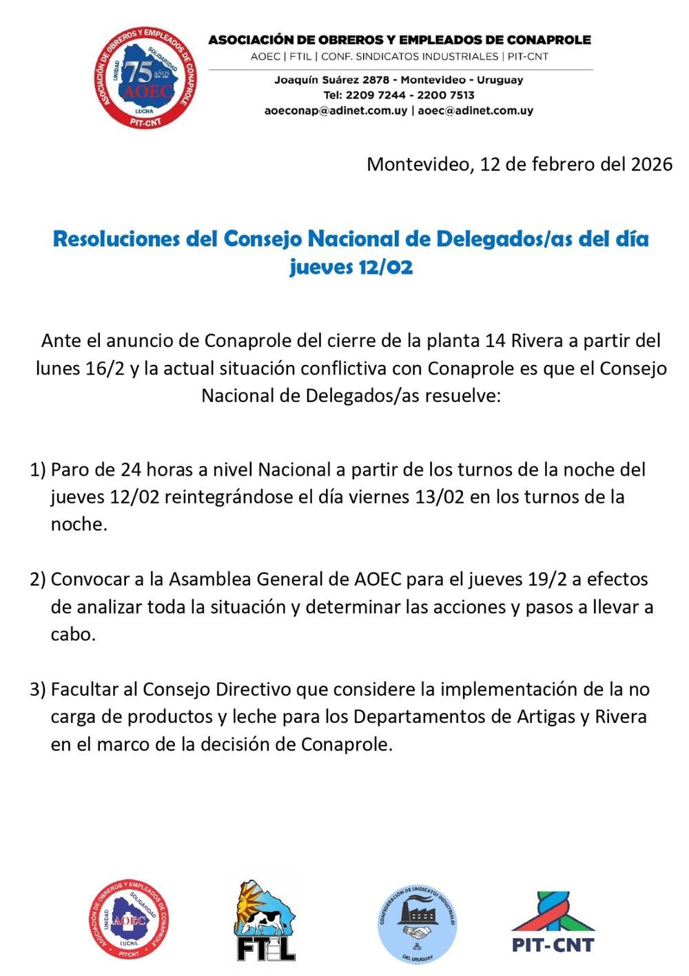 El Consejo Nacional de delegados de la Asociación de Obreros y Empleados de Conaprole (AOEC) decidió que este viernes 13 de febrero se realice un paro de 24 horas, una medida de alcance nacional y en todas las instalaciones de la cooperativa.