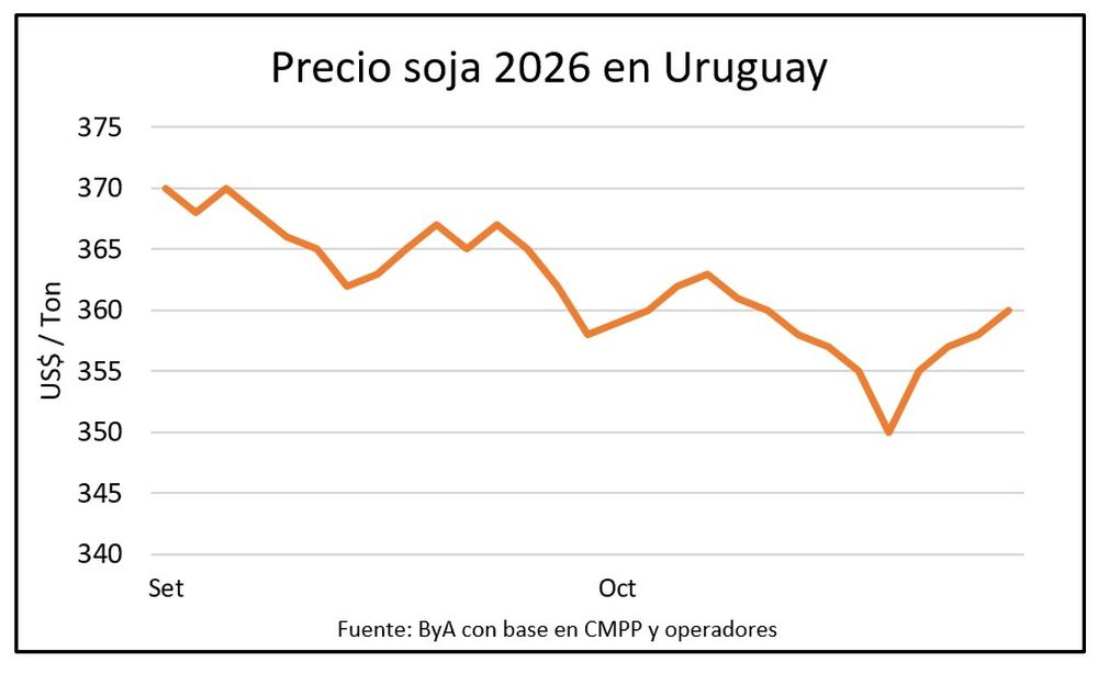 La soja cerró la semana con una suba de US$ 5 por tonelada (+1,2%) a US$ 395 por tonelada en la posición julio 2026 de referencia para la cosecha en Uruguay, y propuestas de operadores que recuperaron los US$ 360 /ton en el mercado local.