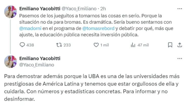 Los tweets de Yacobitti Y agregó: "También para demostrar por qué la UBA es una de las universidades más prestigiosas de América Latina y debemos estar orgullosos de ella y cuidarla. Con datos concretos y estadísticas. Para informar, no desinformar".