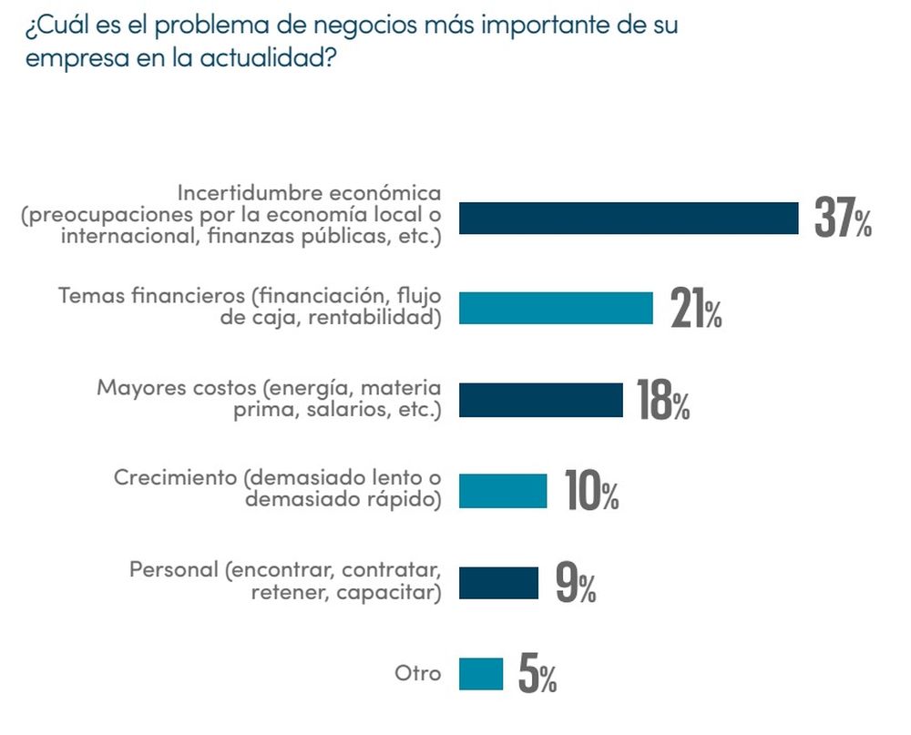 Sobre el problema de negocios más importante de una empresa en la actualidad, el 37% refirió a la incertidumbre económica (preocupaciones por la economía local o internacional, finanzas públicas), el 21% a temas financieros (financiación, flujo de caja, rentabilidad), el 18% a mayores costos (energía, materia prima, salarios), el 10% al crecimiento (demasiado lento o demasiado rápido) y el 9% al personal (encontrar, contratar, retener, capacitar), entre otros puntos.
