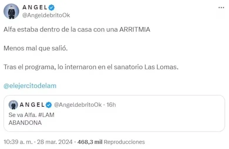 El anuncio del traslado del exconcursante del programa, conducido por Santiago del Moro, al centro médico en San Isidro fue realizado por Ángel de Brito. "Alfa estaba dentro de la casa con una arritmia. Menos mal que salió. Tras el programa lo internaron en el sanatorio de Las Lomas", compartió el periodista a través de su cuenta de Twitter.