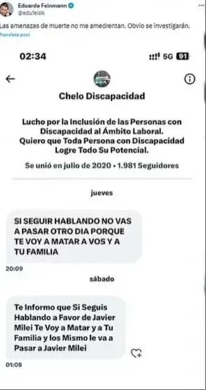 La amenaza fue detectada por primera vez el jueves 21 de diciembre alrededor de las 20.09, cuando el usuario de X “Chelo Dicapacidad” envió a la cuenta personal de Eduardo Feinmann el siguiente texto: “Si seguis hablando no vas a pasar otro día te voy a matar a vos y a tu familia”.