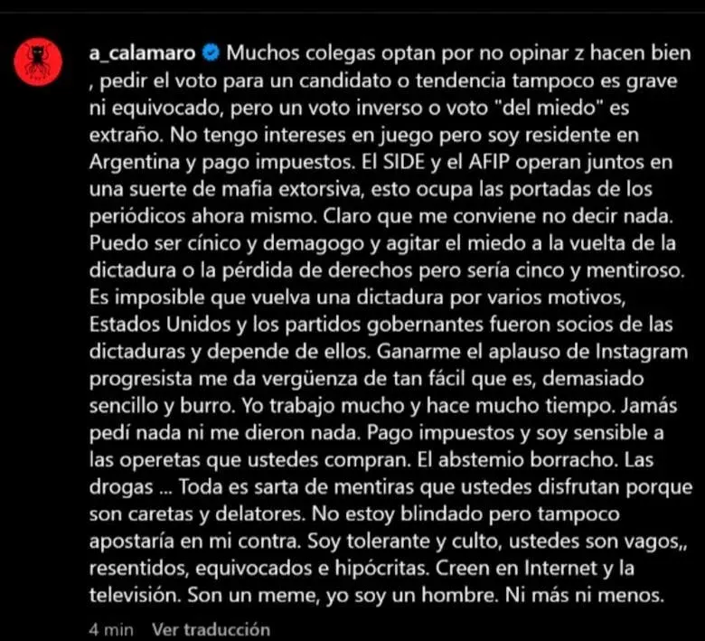 En las últimas horas, a través de sus redes sociales, Andrés Calamaro anticipó que votará por el candidato de La Libertad Avanza, Javier Milei. Además, se encargó de pronosticar un futuro negro para España.