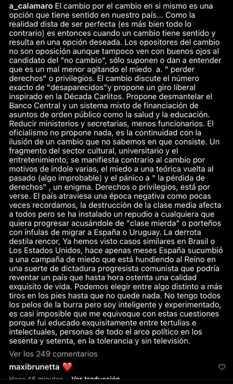 "El cambio por el cambio en sí mismo es una opción que tiene sentido en nuestro país...Como la realidad dista de ser perfecta (es más bien todo lo contrario) es entonces cuando un cambio tiene sentido y resulta en una opción deseada", afirmó. También agregó que "los opositores del cambio no son oposición aunque tampoco ven con buenos ojos al candidato del 'no cambio', solo suponen o dan a entender que es un mal menor agitando el miedo a perder derechos o privilegios".