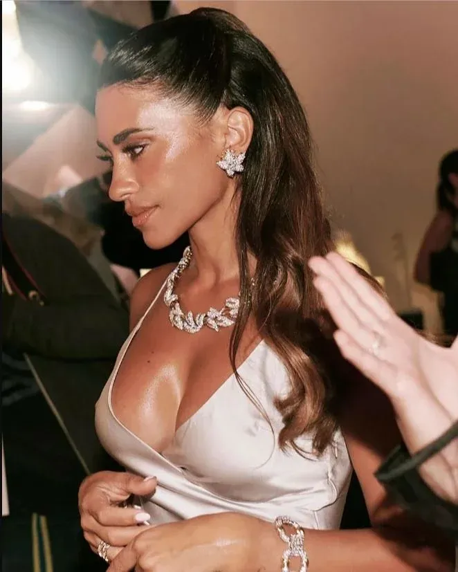 En otra imagen exhibió un brazalete cadena repleto de diamantes y con herraduras en oro y luego el look que eligió ya listo y modelando en la alfombra roja, ataviada con un vestido de satén con escote y tajo y sandalias a tono bajitas.