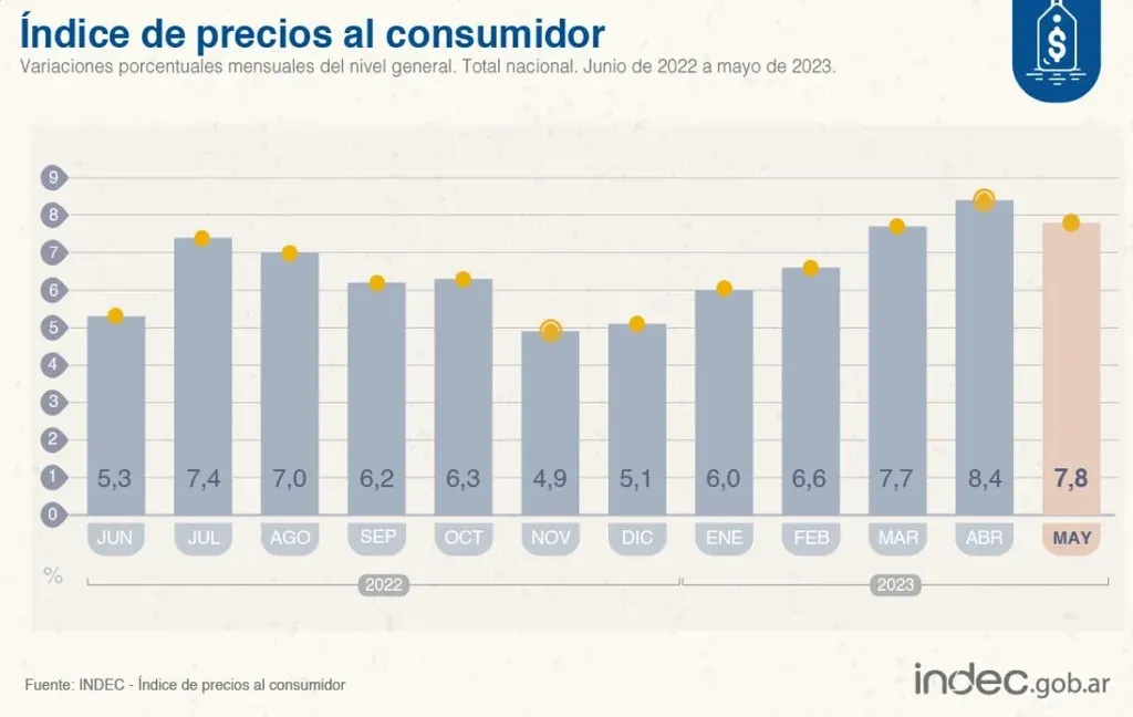 En los últimos doce meses, de junio 2022 a mayo 2023, el número que registró el Indec para la inflación fue del 114,2% y continuó con la tendencia alcista en los aumentos de precios por arriba de las tres cifras que comenzó en febrero.