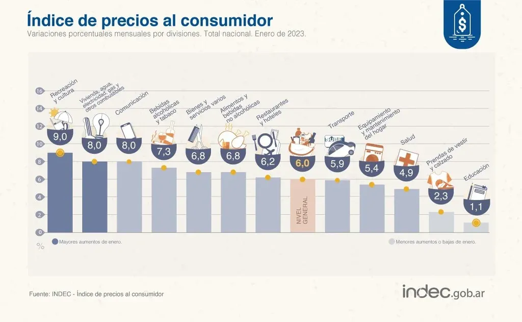 El Instituto Nacional de Estadística y Censos (INDEC) informó que la inflación durante enero fue de 6% y que alcanzó el 98,8% interanual en un mes que se caracterizó por el aumento de precios como la carne, los combustibles y los servicios a principio del año.