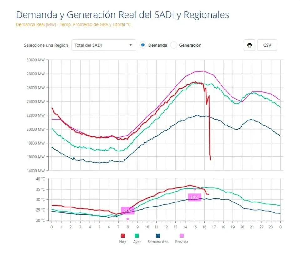 Cammesa, la compañía que administra el mercado eléctrico argentino, muestra una caída abrupta de la demanda de energía a las 16, cuando el termómetro marcaba los 35°C. En ese momento, la demanda del sistema equivalía a 26.570 MW. En menos de media hora, se cayeron 10.000 MW de potencia, según confirmaron fuentes oficiales.