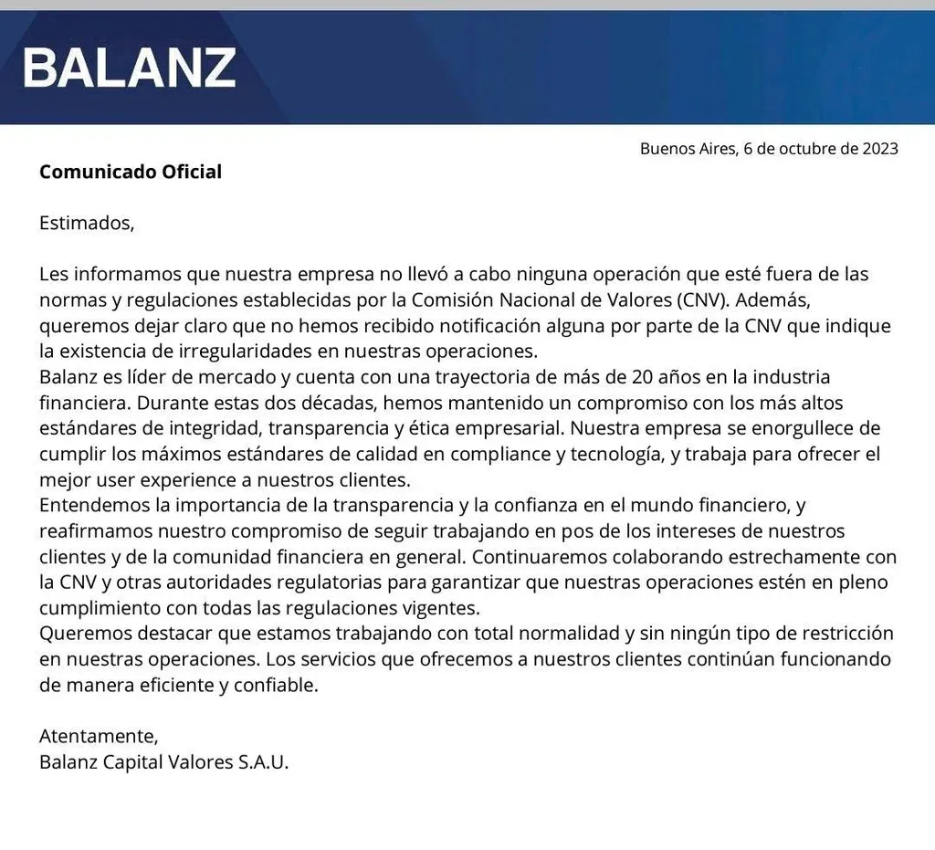 Ante los rumores que se esparcieron principalmente a través de las redes sociales, Balanz emitió un comunicado dirigido a sus clientes mediante el cual, por un lado, intenta llevar tranquilidad y, por otro, desmiente algunas versiones que circularon en las últimas horas.