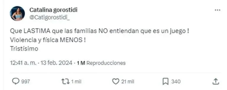 Al concluir la gala de anoche, Catalina Gorostidi compartió un mensaje peculiar en su cuenta de X que captó la atención de muchos. "Que lástima que las familias no entiendan que es un juego. Violencia y física, menos. Tristísimo", escribió la pediatra santafesina sin entrar en detalles.