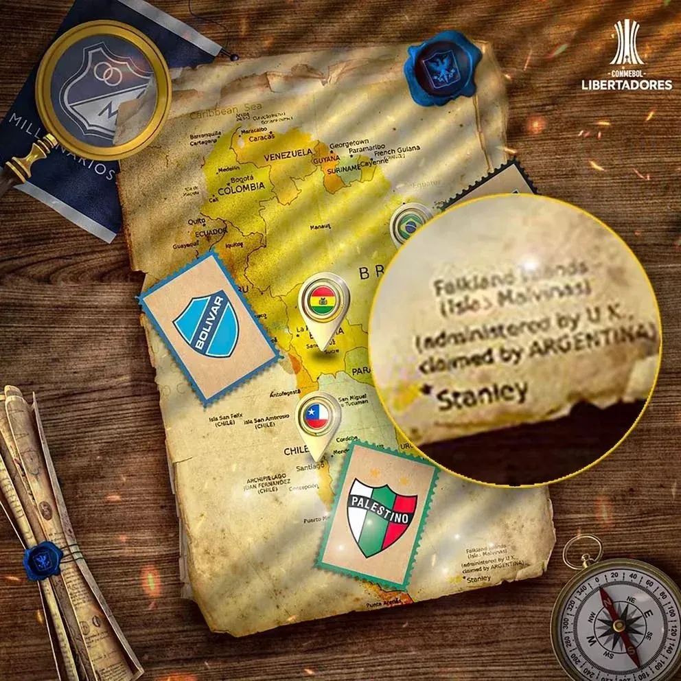 Desde la institución colombiana señalaron: “La ruta trazada en la Conmebol Libertadores. Somos parte del Grupo E junto a Flamengo (Brasil), Bolívar (Bolivia) y Palestino (Chile). ¡Vamos todos unidos! ¡Vamos Millonarios!”. Nuevamente, en el fondo se leía “Falklands Islandas (Islas Malvinas). Administradas por el Reino Unido y reclamadas por Argentina”. El mapa también indicaba que la capital de las Malvinas era Port Stanley, en lugar de Puerto Argentino. Hasta el momento, la Conmebol no ha emitido ningún comentario al respecto.