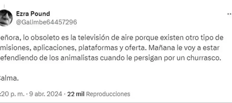Poco después, los comentarios del chef francés fueron recogidos por un medio digital en Twitter, y el propio Calamaro, desde su cuenta "anónima" Ezra Pound (@Galimbe64457296), le respondió con dureza. "Señora, lo obsoleto es la televisión de aire porque existen otro tipo de emisiones, aplicaciones, plataformas y oferta. Mañana le voy a estar defendiendo de los animalistas cuando le persigan por un churrasco. Calma", expresó.