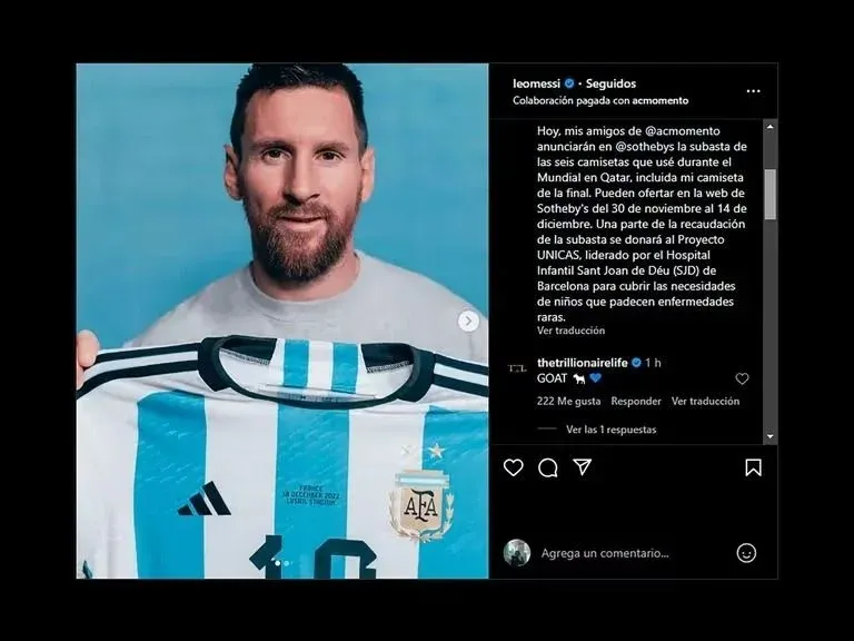 La subasta, organizada por Sotheby's y con las camisetas proporcionadas por la start-up tecnológica AC Momento, inició el 30 de noviembre y se extenderá hasta el 14 de diciembre. Durante este período, los aficionados podrán admirar las prendas en una exposición gratuita en la sede de Sotheby's en Manhattan. Messi ha anunciado en su perfil de Instagram que parte de los fondos recaudados se destinará al Proyecto UNICAS del Hospital Infantil Sant Joan de Déu en Barcelona.