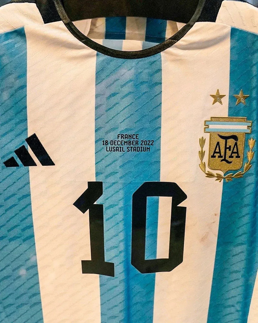 Se especifica que la camiseta con la que Messi levantó la copa no forma parte del lote, pero la disponible en Sotheby's de la final cuenta con detalles de asombrosa autenticidad, como una pequeña mancha debajo del escudo de la AFA, como prueba de la intensa batalla contra la formidable Francia de Kylian Mbappé.
