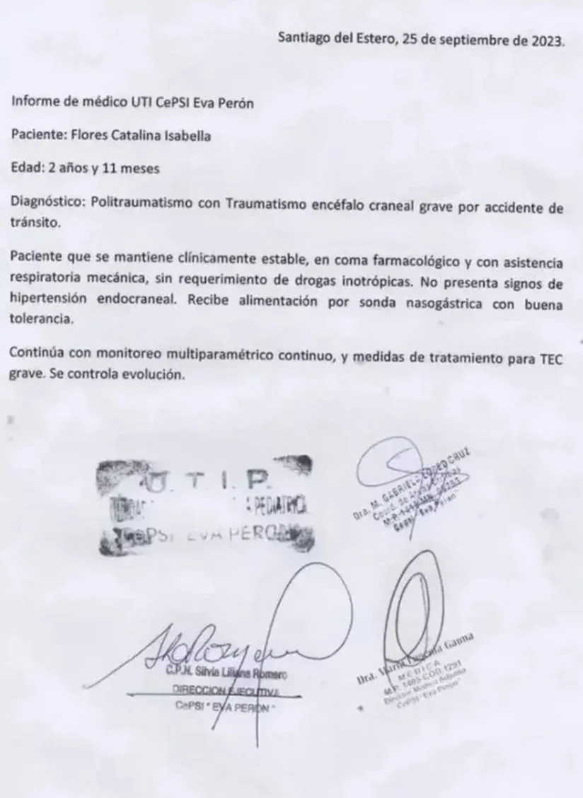 Según el informe médico del Centro Provincial de Salud Infantil (CEPSI), la niña de 2 años y 11 meses que permanece internada desde el trágico accidente, "se mantiene clínicamente estable, en coma farmacológico y con asistencia respiratoria mecánica, sin requerimiento de drogas inotrópicas".