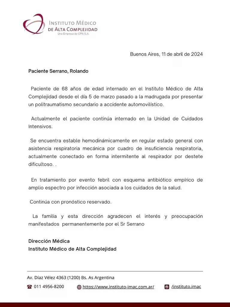 A 40 días del trágico suceso, el Instituto Médico de Alta Complejidad (IMAC) emitió un nuevo parte médico para informar sobre la situación de salud del actor de 68 años. Según el comunicado de la dirección médica de la institución, Serrano sigue ingresado en la Unidad de Cuidados Intensivos, manteniendo estabilidad hemodinámica en un estado general regular. Se encuentra bajo asistencia respiratoria mecánica debido a una insuficiencia respiratoria, y aunque se ha intentado disminuir gradualmente esta asistencia, el proceso ha resultado difícil.