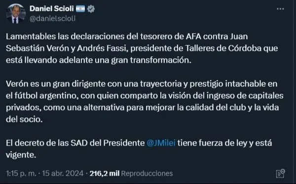 "Considero lamentables las declaraciones del tesorero de la AFA contra Juan Sebastián Verón y Andrés Fassi, presidente de Talleres de Córdoba, quien está liderando una notable transformación", fueron las primeras palabras del político.