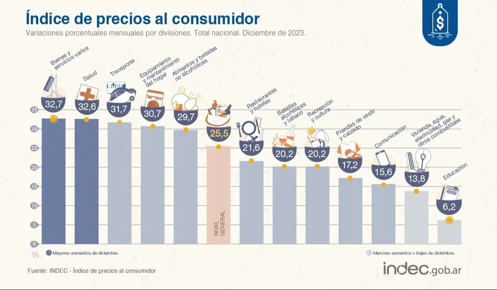 El Instituto Nacional de Estadísticas y Censos (INDEC) anunció hoy que el Índice de Precios al Consumidor (IPC) de diciembre experimentó un incremento del 25,5%, situándose así en un acumulado del 211,4% en el año 2023, la cifra anual más elevada desde 1990.