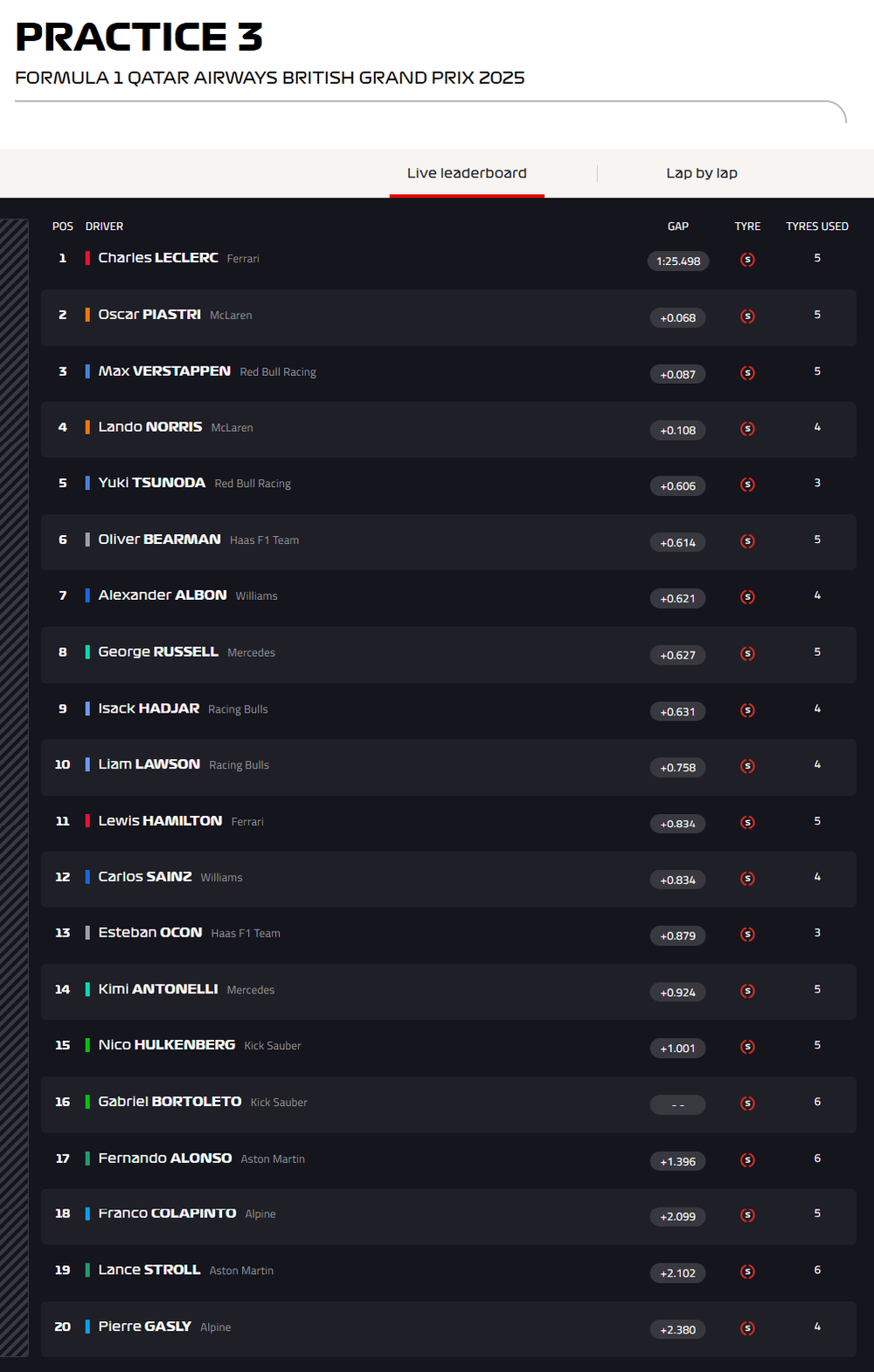 Resultados de la Práctica Libre 3 del Gran Premio de Gran Bretaña de la Fórmula 1
