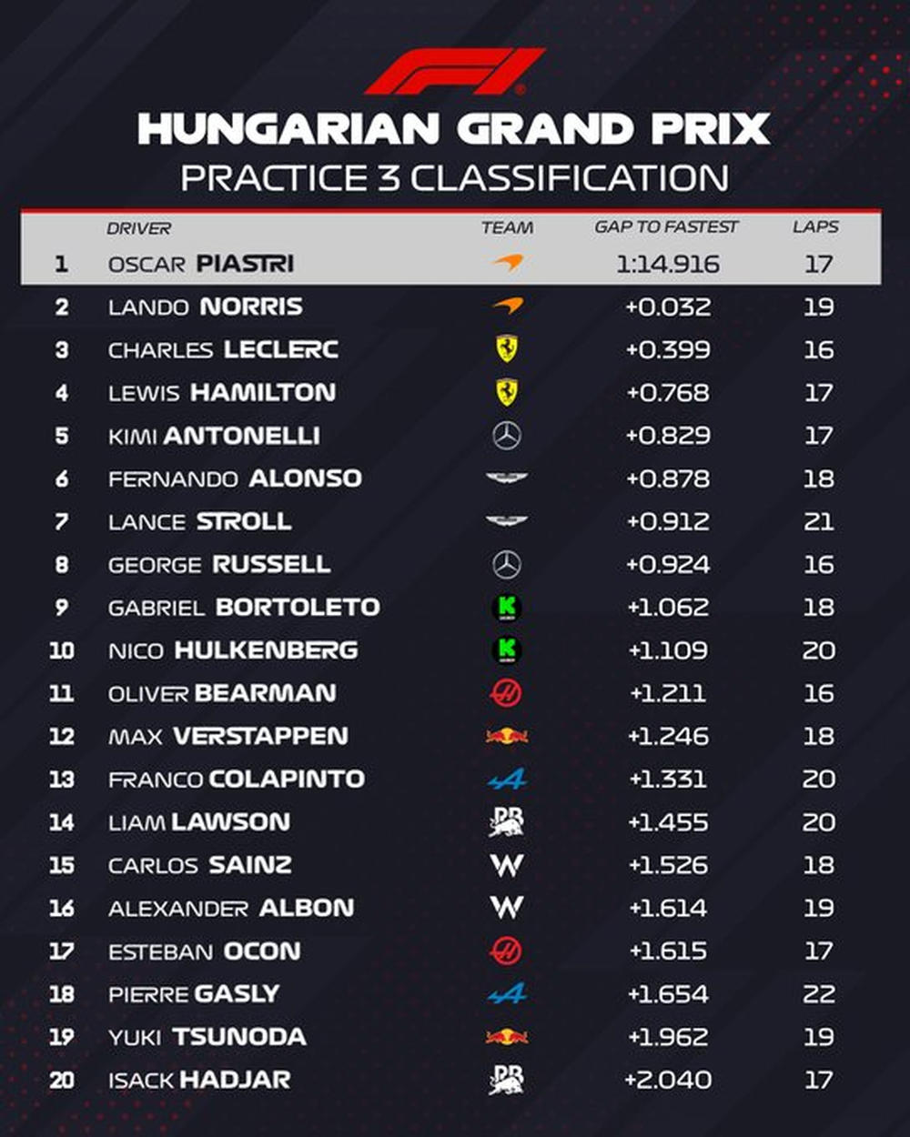 El piloto argentino perteneciente a la escudería Alpine, Franco Colapinto, finalizó decimocuarto en la Clasificación disputada este sábado en el circuito de Mogyoród del Gran Premio de Hungría de la Fórmula 1.