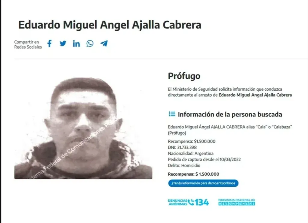 El Ministerio de Seguridad de la Nación había ofrecido una recompensa de $1.500.000 para quien pudiera ofrecer información sobre su paradero.