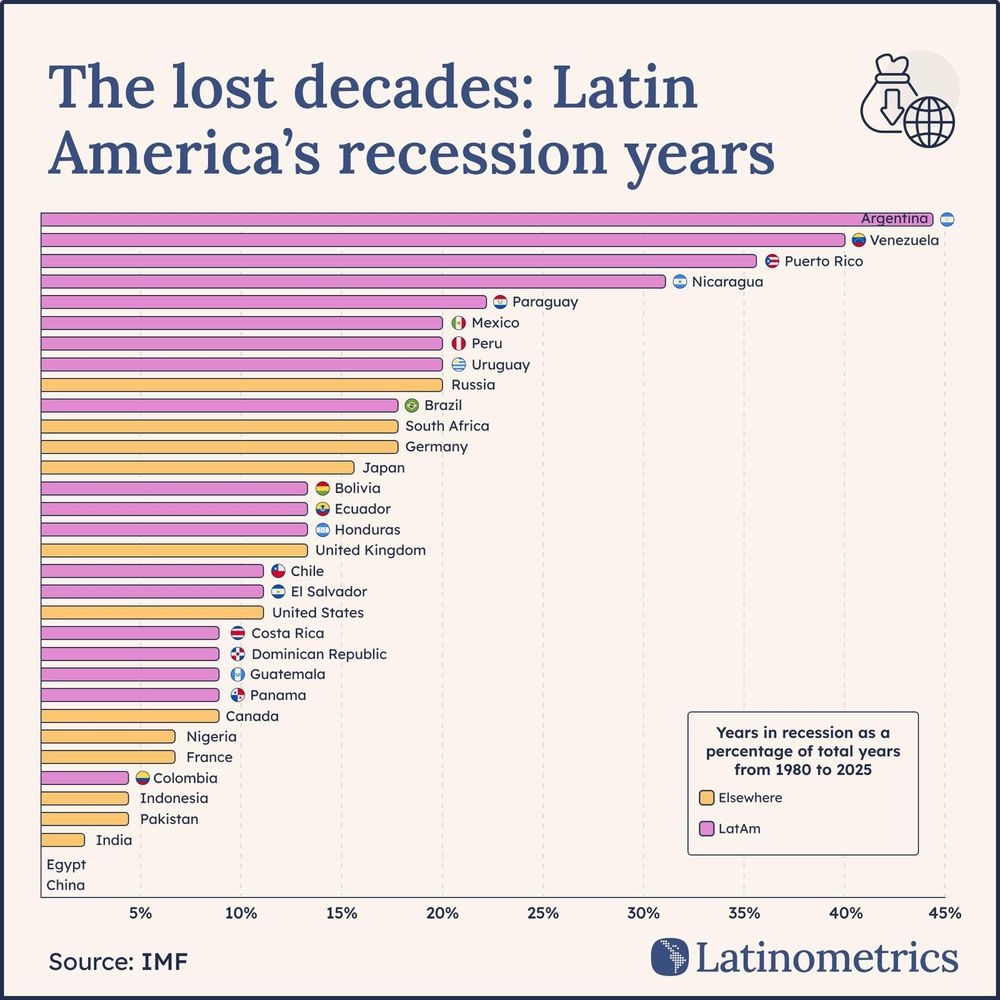 El análisis elaborado por El Observador en colaboración con Latinometrics (empresa de análisis de datos sobre América Latina) muestra que ningún otro país de la región acumuló tantos años de retroceso económico en ese período. La persistencia del estancamiento argentino contrasta con otras economías emergentes y también con las desarrolladas: Rusia, Brasil, Sudáfrica y Alemania registraron entre 15% y 20% de años en recesión, mientras que Japón apenas superó el 13%. Estados Unidos quedó en el extremo inferior del gráfico junto a India, Egipto y China.