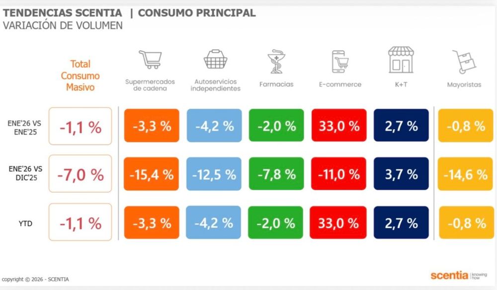 "En línea a lo que veníamos observando en los últimos meses de 2025, el rubro kioscos y almacenes, si bien continúa con variación positiva, lo hace de manera más desacelerada. En el caso de los supermercados, también presentan continuidad en la desaceleración iniciada en el último bimestre de 2025, pero de manera inversa, con una retracción menor", sostuvo Scentia.