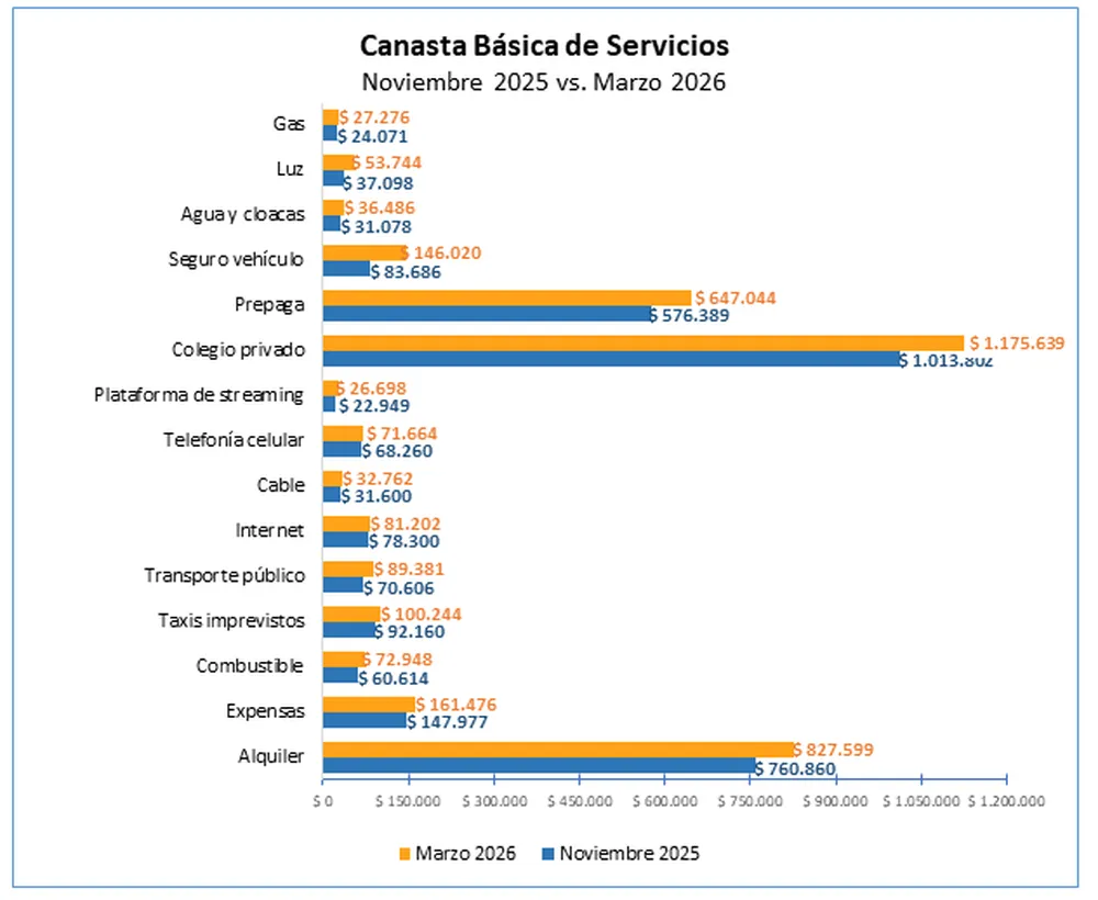 En términos totales, la canasta completa de servicios para una familia tipo ascendería en marzo de 2026 a $2.980.339. Esto representa un 22,25% más que en noviembre del año pasado. Dado que se contemplan únicamente los servicios en ella, el nivel de gasto resulta elevado en relación con los ingresos percibidos por el hogar. Además, duplica la inflación acumulada estimada del período, que se ubicaría por debajo del 10%. En parte, esto se explica porque los mayores incrementos se concentran en rubros que venían de un atraso o contención tarifaria y que, en muchos casos, los servicios privados no ajustan sus aumentos a la nueva “normalidad” inflacionaria.