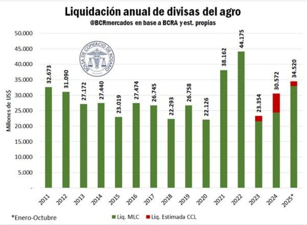 De ese monto, casi US$ 33.000 millones fueron liquidados en el Mercado Libre de Cambios, según datos del Banco Central, de Cámara de la Industria Aceitera de la República Argentina y del Centro Exportador de Cereales; y un estimado de US$ 1.550 millones ingresados vía el dólar Contado con Liquidación (CCL).