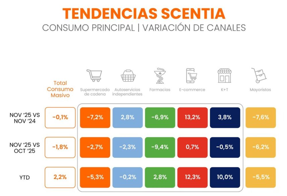 El total del consumo masivo tuvo una caída interanual de -0,3%. El comercio electrónico tuvo una variación positiva del 32,3%, los autoservicios independientes del 2,9% y kioscos y tiendas del 0,3%.