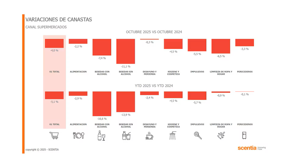 Los datos difundidos por Scentia indicaron que, en el acumulado de los primeros 10 meses del año, el consumo total creció 2,4%. Sin embargo, el desempeño resultó muy desigual según el canal, con grandes superficies aún condicionadas por la contracción de la demanda y comercios más pequeños que lograron sostener el movimiento.