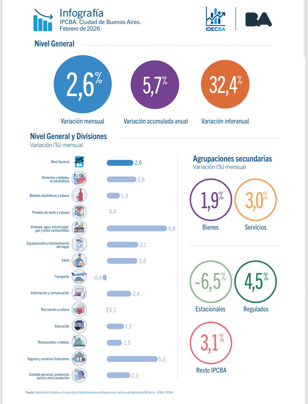 En la antesala del indicador del INDEC, el Instituto de Estadística y Censos de la Ciudad Autónoma de Buenos Aires (IDECBA) informó el lunes un alza de precios promedio en el distrito porteño de 2,6% en febrero. La variación estuvo impulsada por aumentos de los rubros Gastos de la Vivienda, agua, electricidad, gas y otros combustibles (5,9%), Salud (3%) y Alimentos (2,9%).