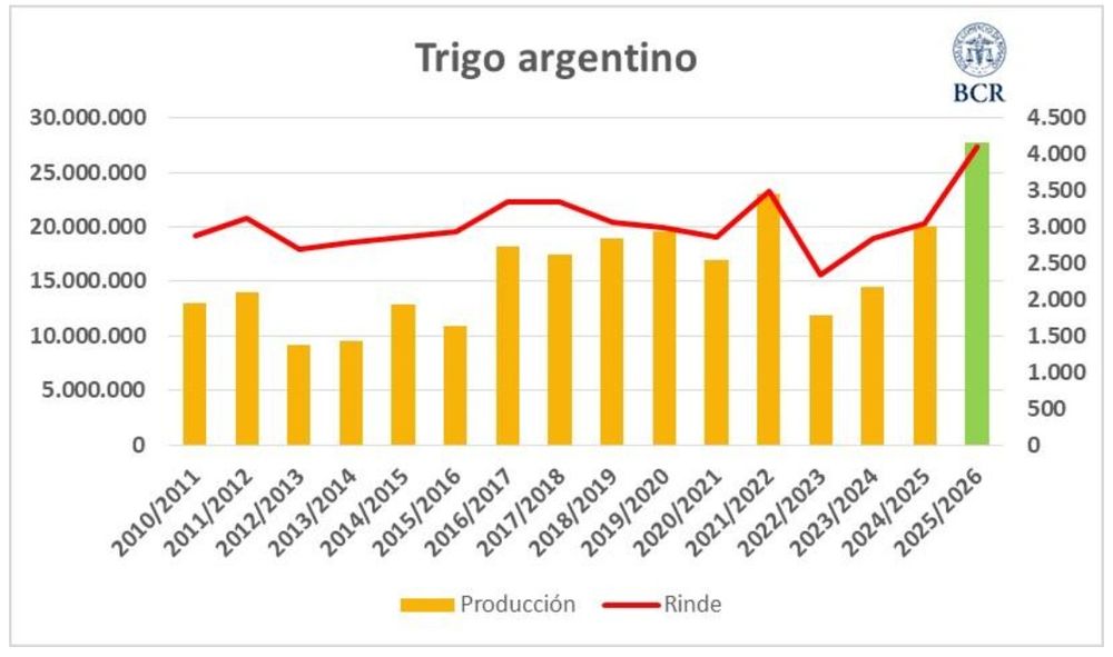La producción de trigo alcanzaría un nuevo récord histórico para el país de 27,7 millones de toneladas (Mt) en la campaña 2025/26, un 37% más que en el ciclo previo, y que supera los 23 Mt obtenidos en la temporada 2021/22.