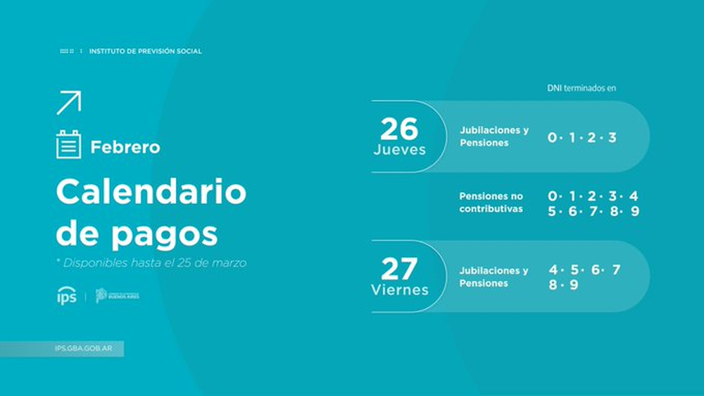 El Instituto de Previsión Social (IPS) de la provincia de Buenos Aires publicó el calendario de pagos de febrero 2026 para jubilados y pensionados bonaerenses.